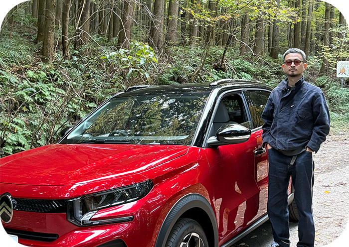 「あっ、来た来た! いい色ですね〜」。ルージュエリクシールというカラーの相棒に目を奪われながら、うどんを完食するとすぐさま外に出て、C3の隅々をチェック。「ここのラインが!」、「この角度からのC3、かっこいいね!」、「なるほど、なるほど」とぐるりと1周、そしてまた1周、細部までC3のディテールを楽しむ長岡さん。とはいえ、ここはSAの駐車場、側から見ると少し怪しい姿だったのかもしれません……(笑)。