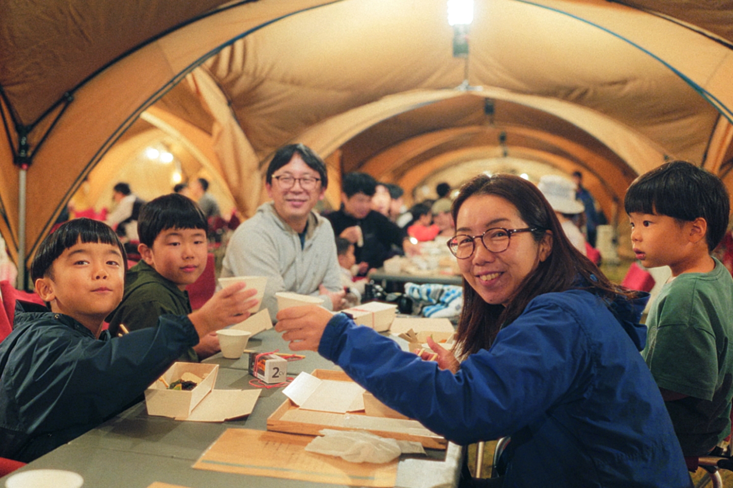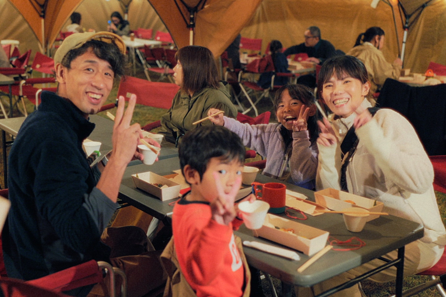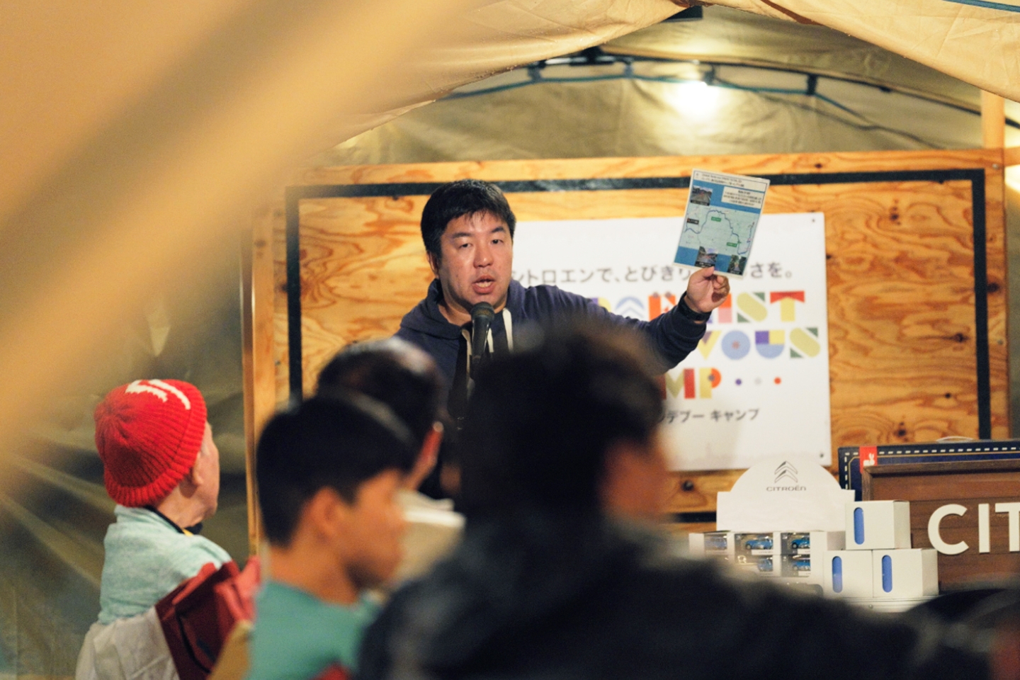 前夜祭の大きな楽しみのひとつが、キャンプ場スタッフのみなさんが心を込めて用意した夕食。じつは、シトロエンが開催するキャンプイベントの料理はいつもおいしいと評判なのです。参加者への事前インタビューでも、「何が楽しみ?」の問いに「食事」の声が多数。地元食材をふんだんに使った温かい料理が並び、一泊できるキャンプらしくお酒も振る舞われて、どのテーブルにも笑顔があふれていました。