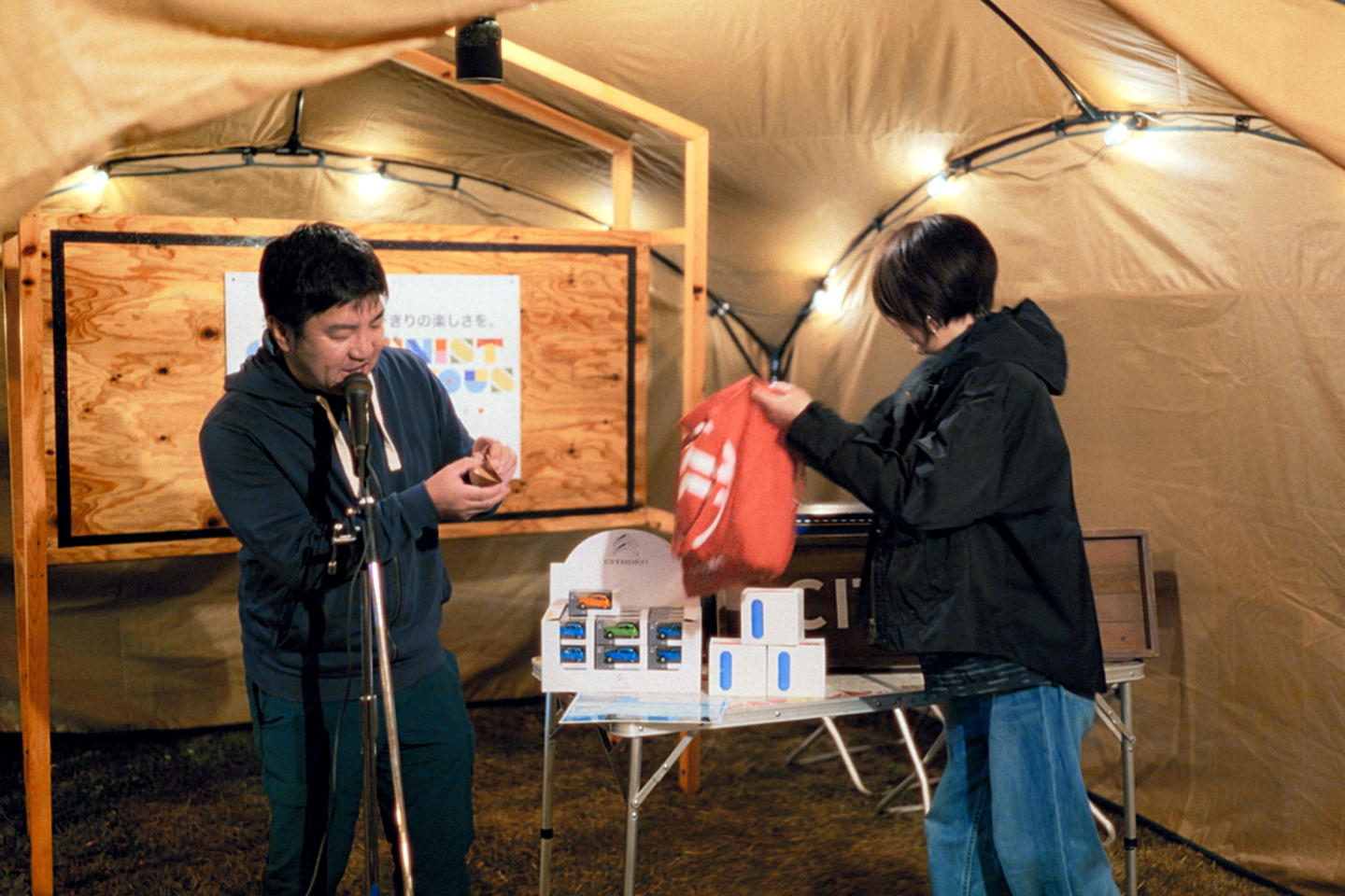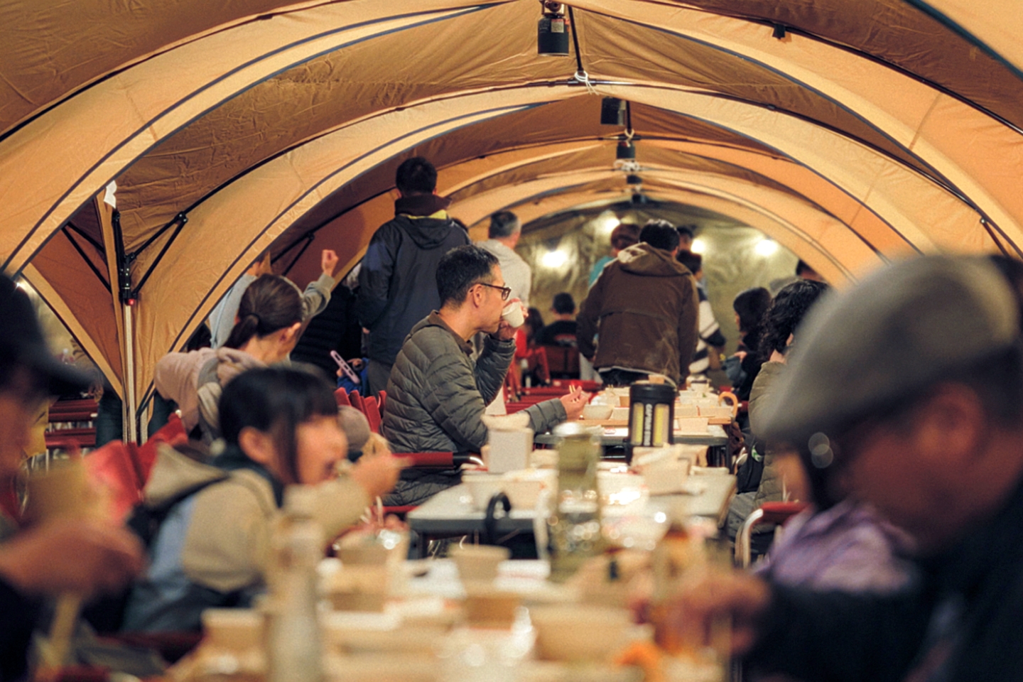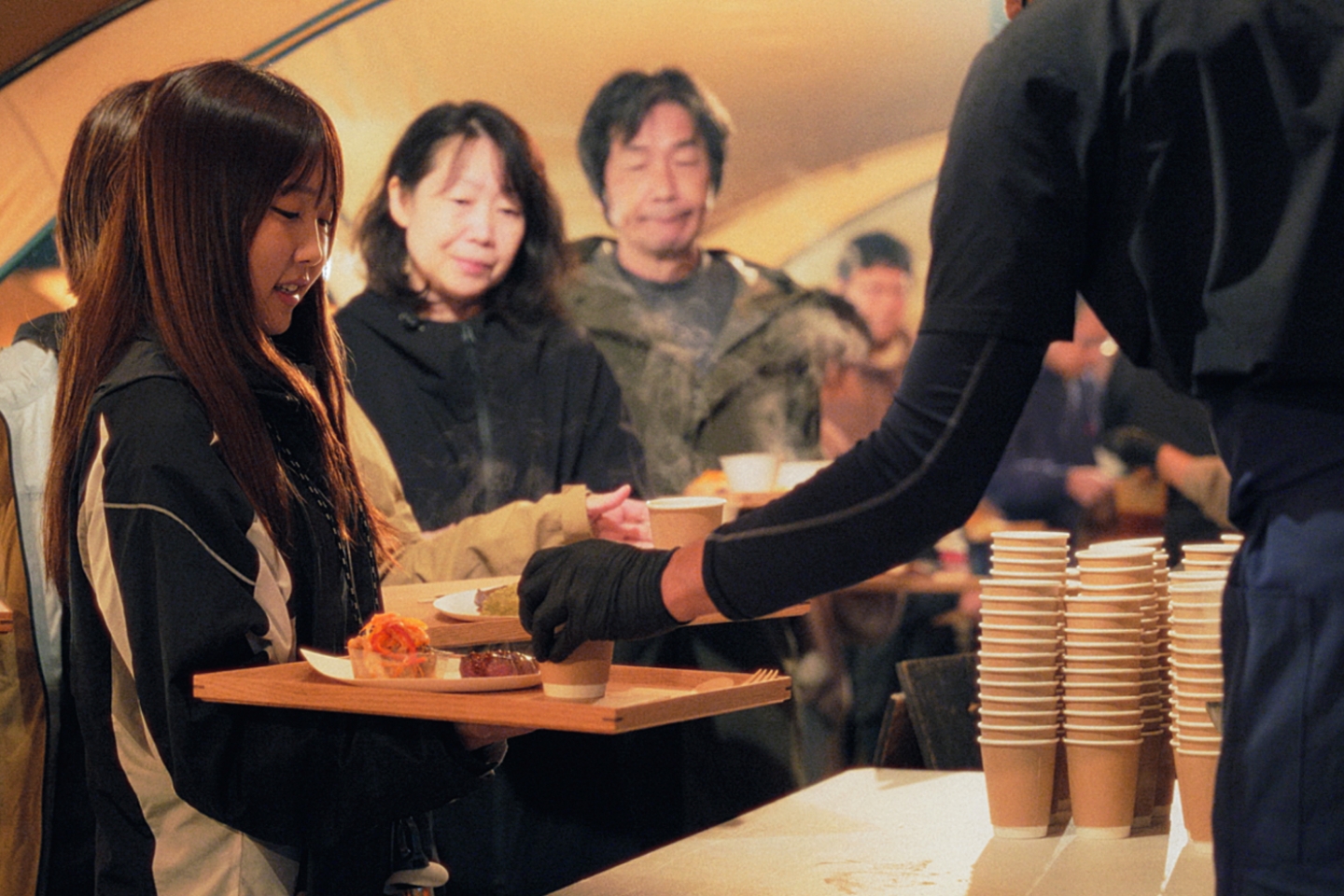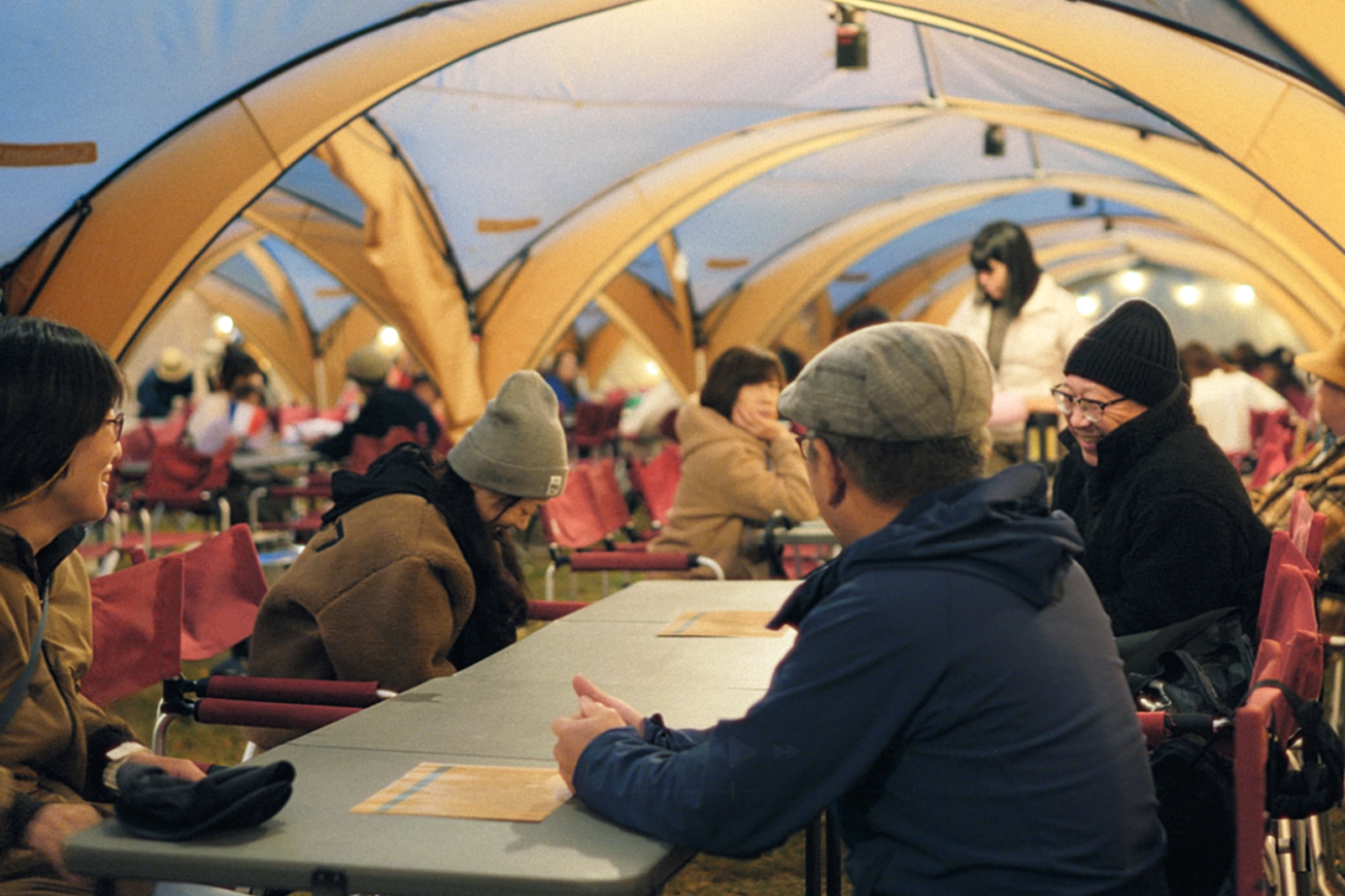 前夜祭の大きな楽しみのひとつが、キャンプ場スタッフのみなさんが心を込めて用意した夕食。じつは、シトロエンが開催するキャンプイベントの料理はいつもおいしいと評判なのです。参加者への事前インタビューでも、「何が楽しみ?」の問いに「食事」の声が多数。地元食材をふんだんに使った温かい料理が並び、一泊できるキャンプらしくお酒も振る舞われて、どのテーブルにも笑顔があふれていました。